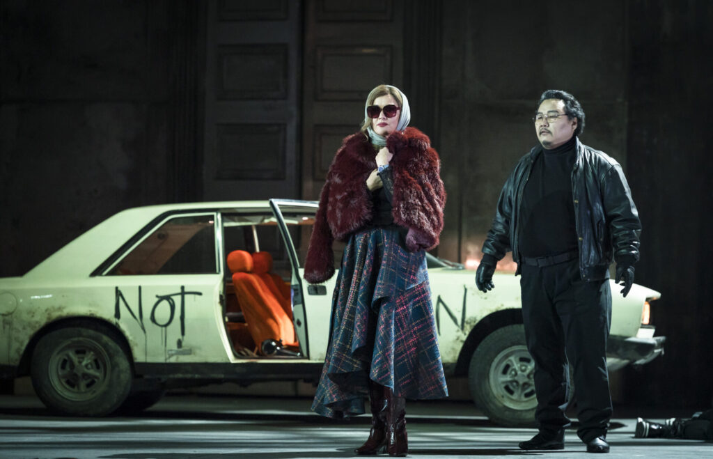 Die Inszenierung von Raffael Villalobos ist eine Koproduktion mit dem Palau de les Arts Reina Sofia in Valencia. Die Arbeit, sofern sie ein Konzept hat, lässt ein solches aber nicht erkennen. Der Regisseur ließ sich von Emanuele Sinisi einen grauen Betonbunker bauen, der für die einzelnen Akte nur marginal verändert wird. Als fahle Beleuchtung dienen Neonröhren, ein halb abgewracktes Auto ist fast die einzige „Möblierung“ der Szene.